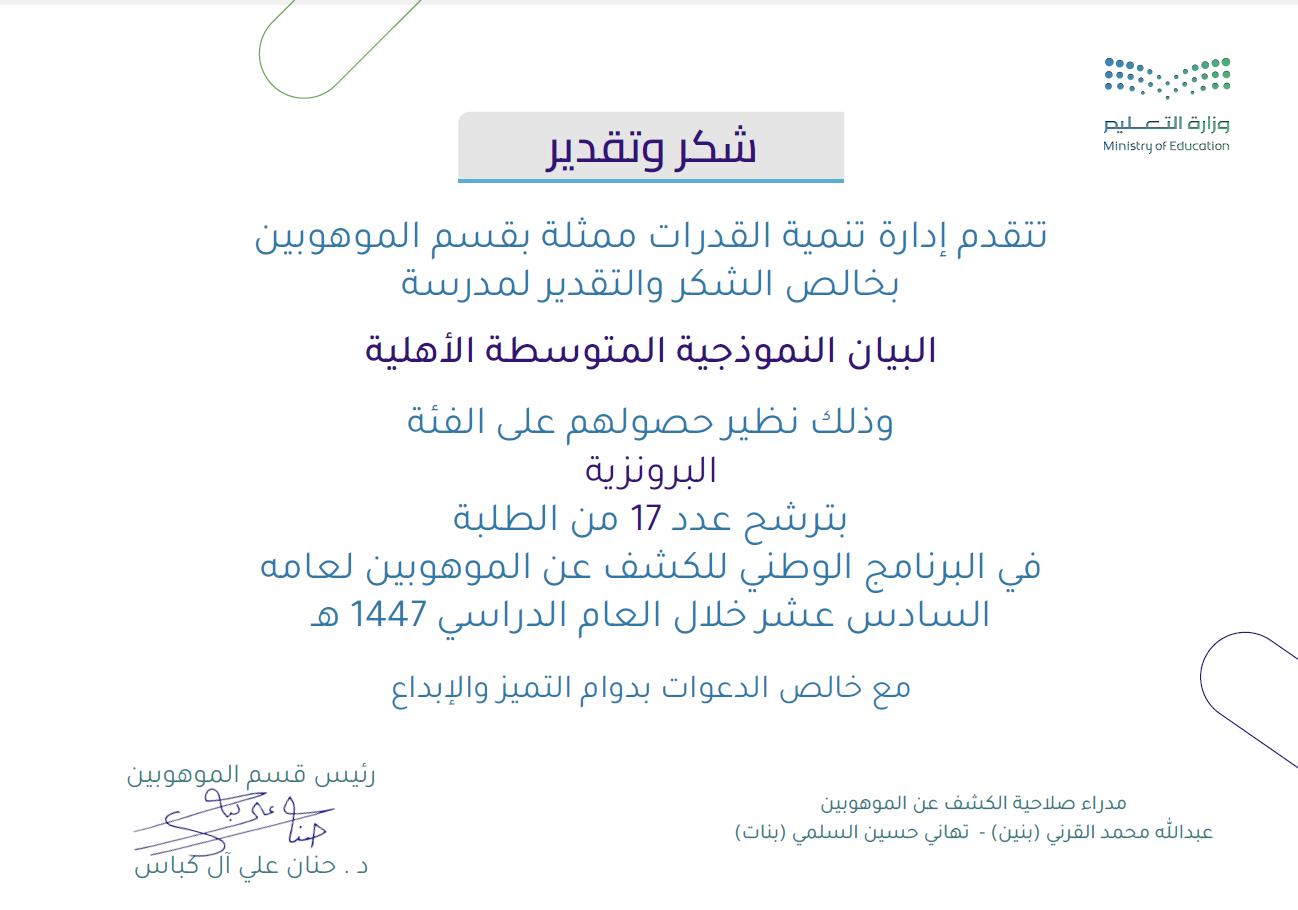 مبارك حصول مدرسة البيان النموذجية ( قسم المتوسط ) على الفئة البرونزية  في البرنامج الوطني للكشف عن الموهوبين