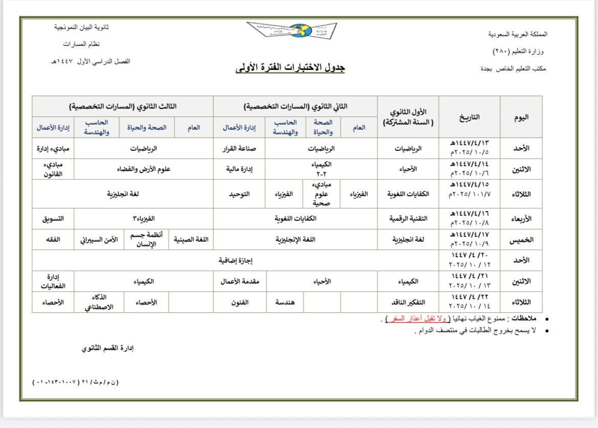 جدول اختبار الفترة الأولى لقسم الثانوي